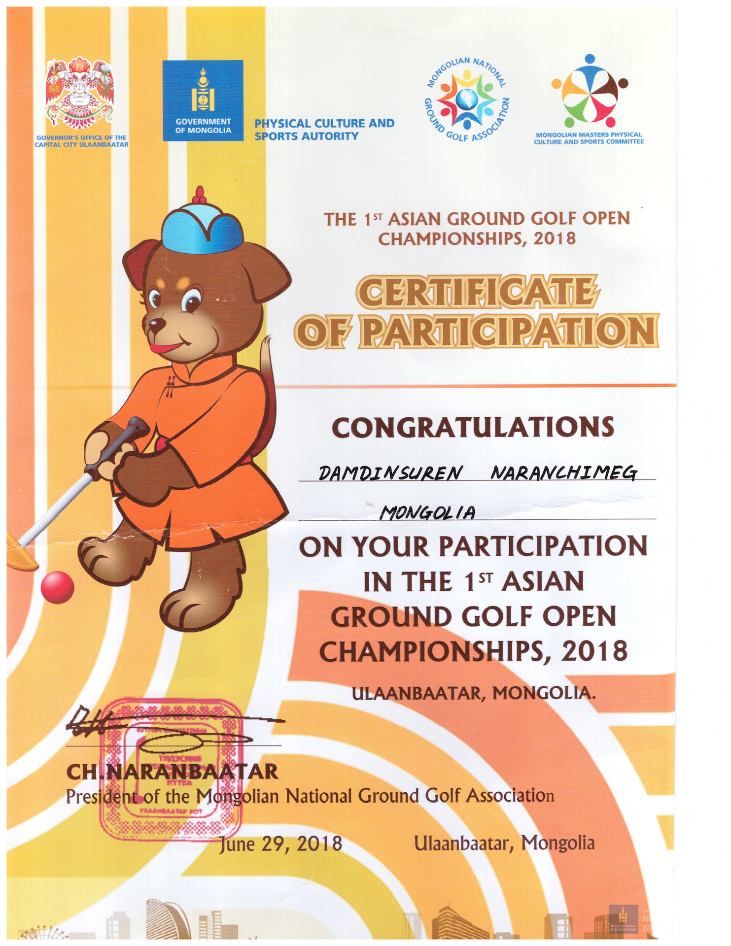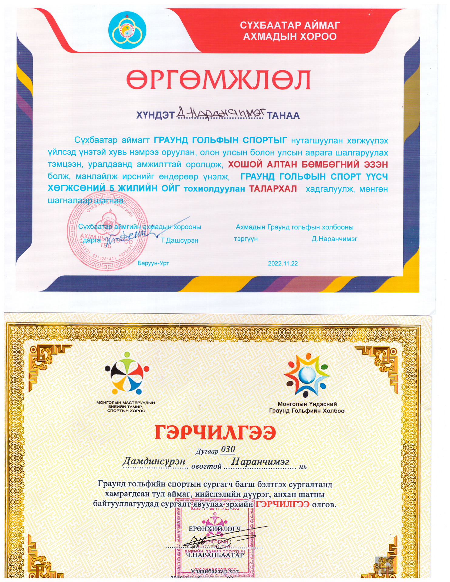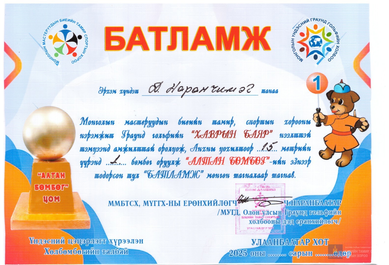 2025 оны Улаанбаатар хотын аварга шалгаруулах "Хаврын баяр Граунд гольф"-ийн тэмцээнд Сүхбаатар аймгийн тамирчин спортыэн дэд мастер ДАМДИНСҮРЭНГИЙН НАРАНЧИМЭГ оролцож алтан бөмбөгийн эзэн болж Япон улсад болох Олон улсын аварга шалгаруулах тэмцээнд оролцох эрх БАТЛАМЖ авлаа. Таны цаашдын тэмцээнд өндөр амжилт хүс