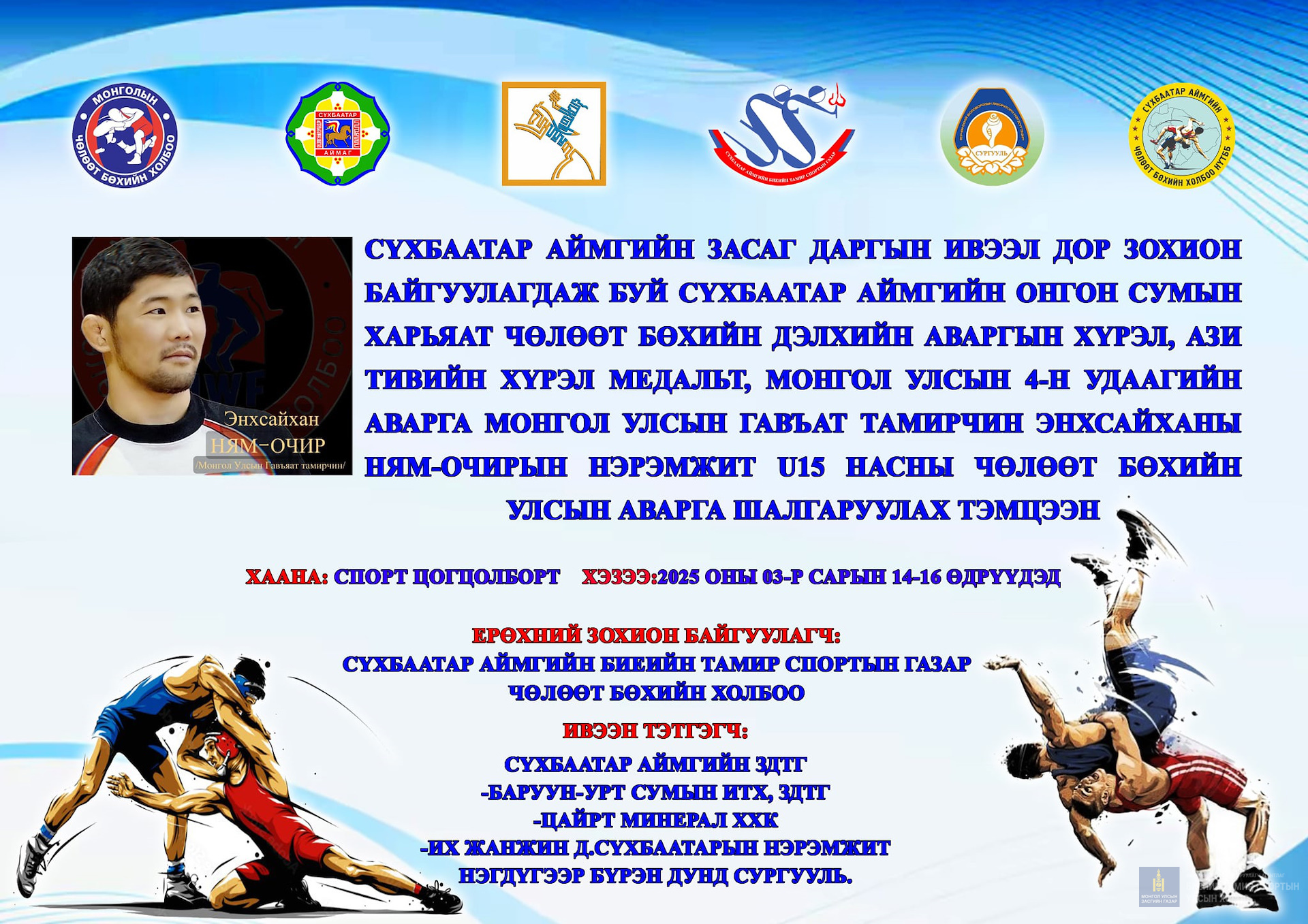 ЭНХСАЙХАНЫ НЯМ-ОЧИРЫН НЭРЭМЖИТ U15 НАСНЫ ЧӨЛӨӨТ БӨХИЙН УЛСЫН АВАРГА ШАЛГАРУУЛАХ ТЭМЦЭЭН Спорт цогцолборт 2025 оны 03 сарын 14-16 өдрүүдэд зохион байгуулагдаж байна.
